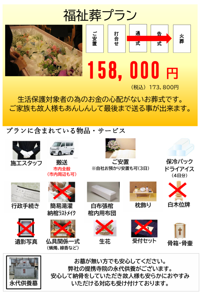 生活保護対象者の為のお金の心配がないご葬儀です。 ご家族も故人様もあんしんして最後まで送る事が出来ます。